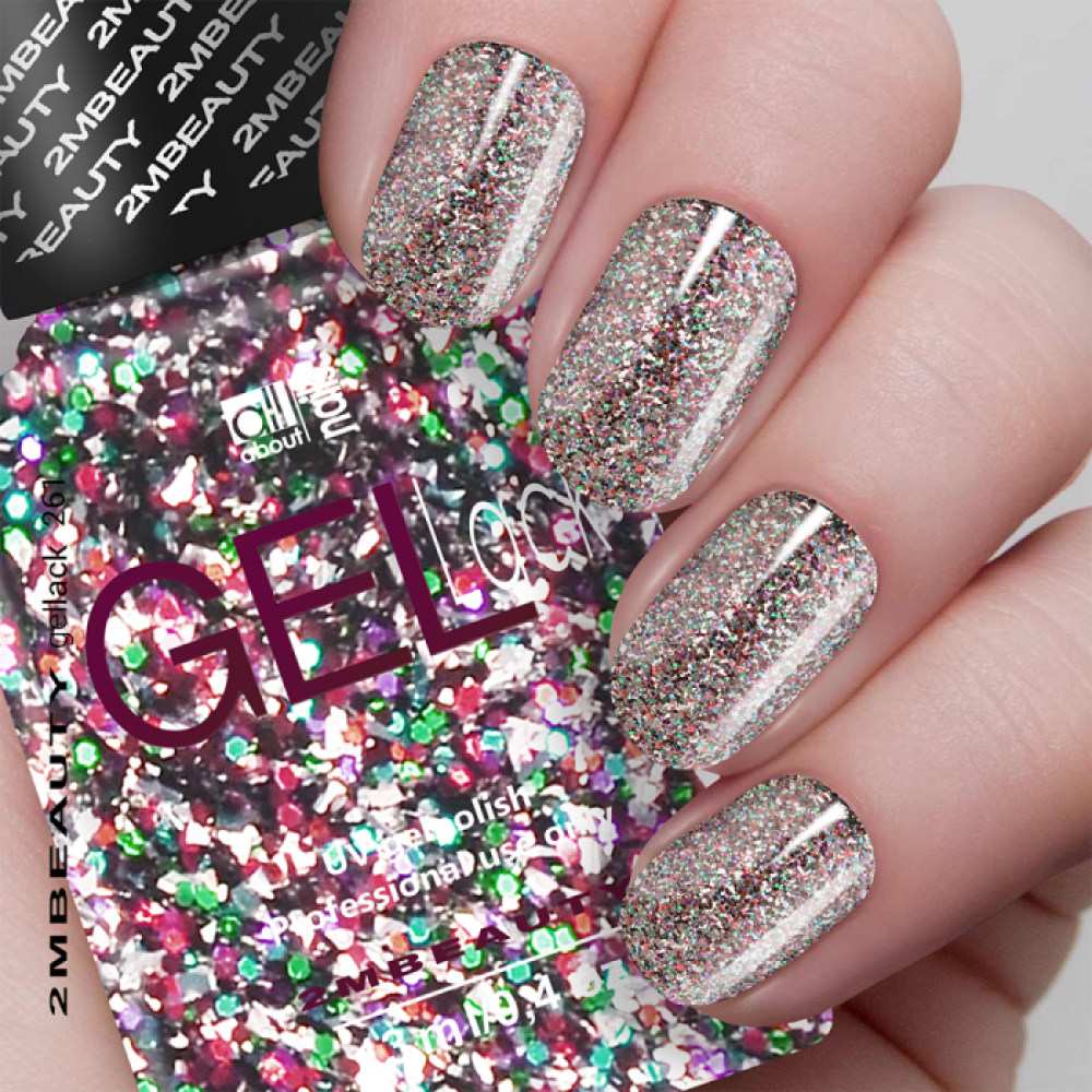 Gel lak sa magenta, zelenim i srebrnim šljokicama.PAŽNJA! Pre upotrebe dobro promućkati!Vreme sušenja u lampi: 0,5-1 minut.Pakovanje: 5 i 13 ml.