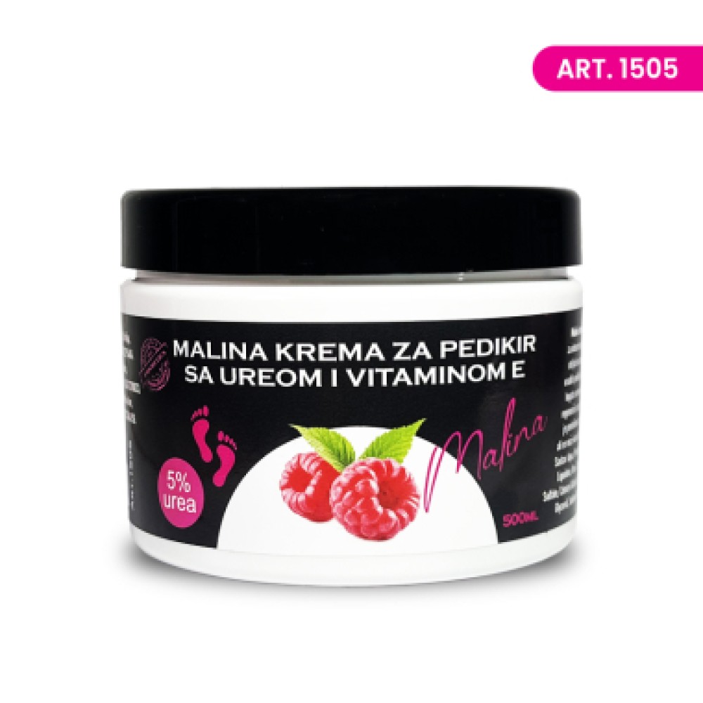 Malina krema za pedikir sa 5% uree i vitaminom E, za intenzivnu negu i masažu stopala i nogu. Lako se upija, hidrira i regeneriše suvu, tvrdu i ispucalu kožu stopala. Krema je predviđena za profesionalnu upotrebu u salonima, ali se može koristiti i za ličnu upotrebu za negu stopala. 500ml