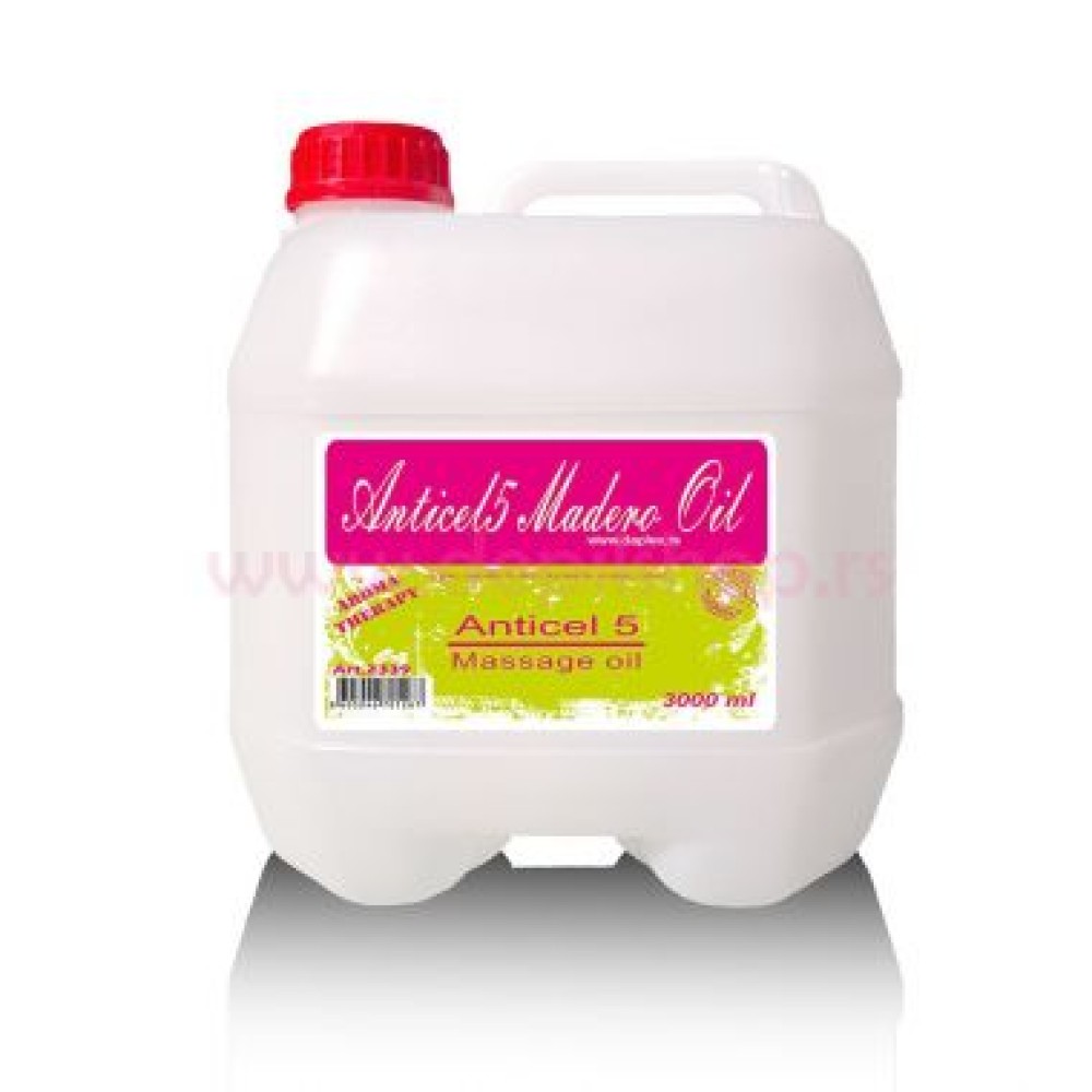 Anticel5 madero masaž ulje je kombinacija prirodnog baznog ulja susama, mineralnog ulja, prirodnog ulja argana i aktivnih komponenti uljanog ekstrakta đumbira i kestena, te eterskih ulja ruzmarina, pomorandže i cimeta koji razbijaju celulit, zetežu kožu i vraćaju elastičnost.Ova formula uz redovnu masažu smanjuje celulit, a koža postaje zategnuta. Nestaje grupisani celulit, telo se preoblikuje. Ulje je namenjeno za profesionalnu upotrebu, dobro se upija i ima odličan efekat klizanja pri masaži. Preporučuje se kod maderoterapije i ručne masaže.