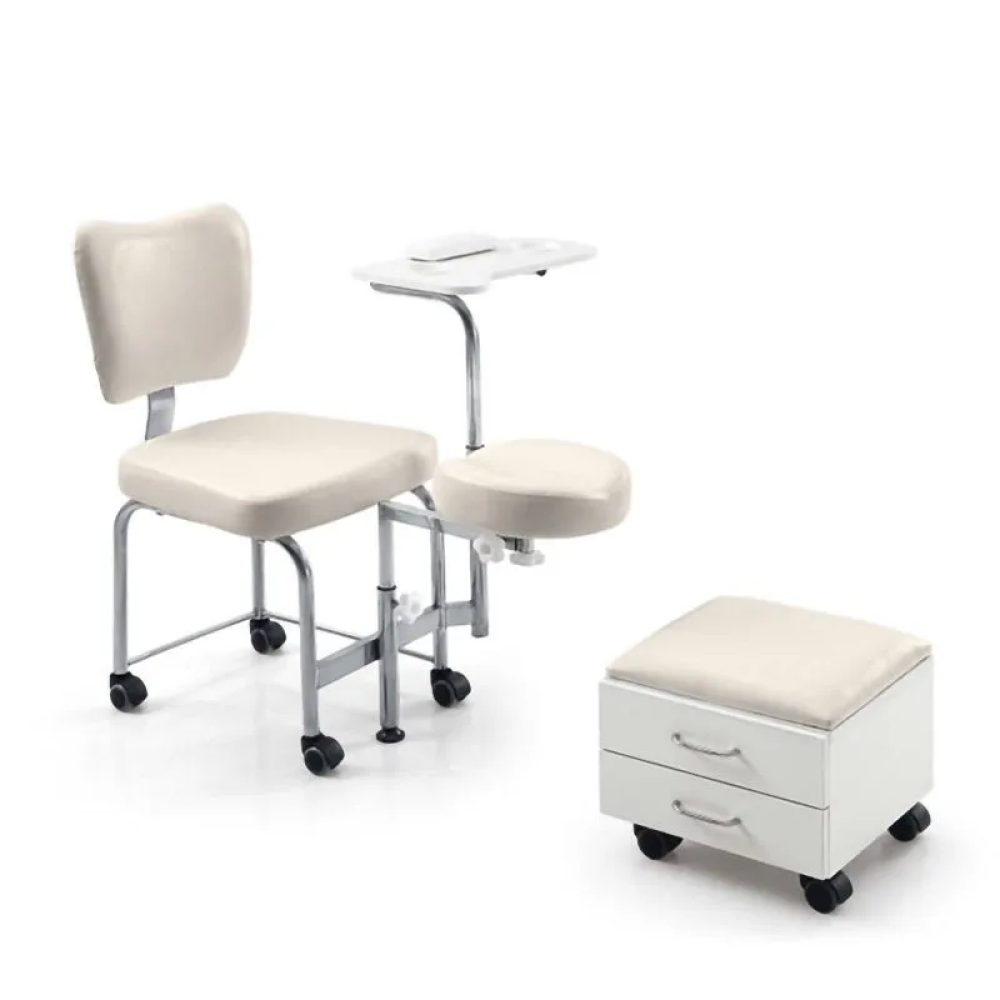Izuzetna i sofisticirana stolica za pedikir dolazi opremljena ormarom za odlaganje osnovnih preparata za izvođenje tretmana pedikure i podesivim osloncem za noge.