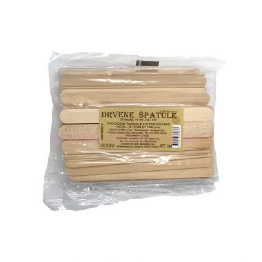 Špatule drvene. Pakovanje 100 kom dimenzija 14,7cm x 1,4cm. Koriste se i za depilaciju i za nanošenje krema i maski u kozmetičkim salonima. Špatule se mogu koristiti i u ordinacijama za pregled grla.