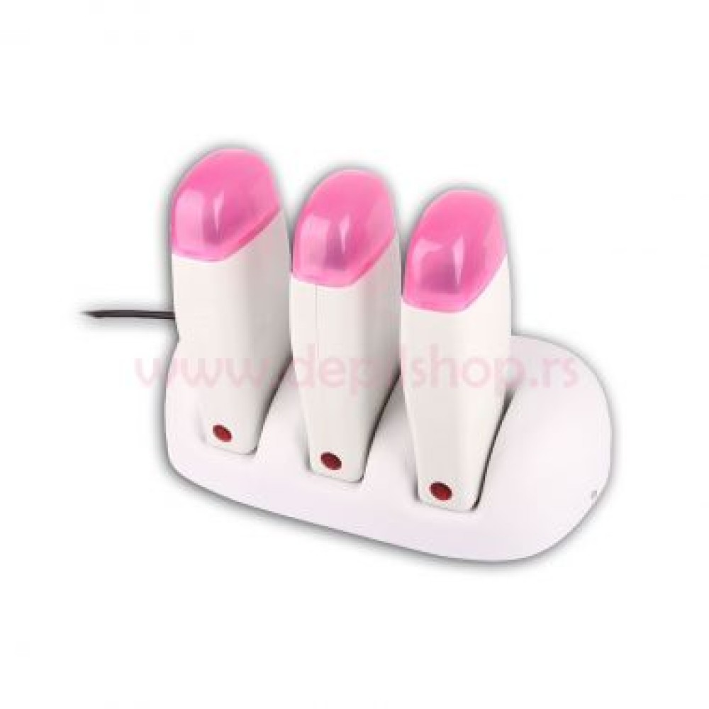 Aparat sa tri pištolja za 100-gramske patrone sa termostatom i postoljem. Ovo je aparat za profesionalnu upotrebe. Nema termostat. Kod ovog aparata je bitno da u njega idu 100-gramske patrone bilo kojeg proizvođača i bitno je samo da ga održavate čistim da Vam vosak ne uđe unutra u pištolj i u ulaz za napajanje strujom jer će Vam onda napraviti kratak spoj i to ne ulazi u reklamaciju.