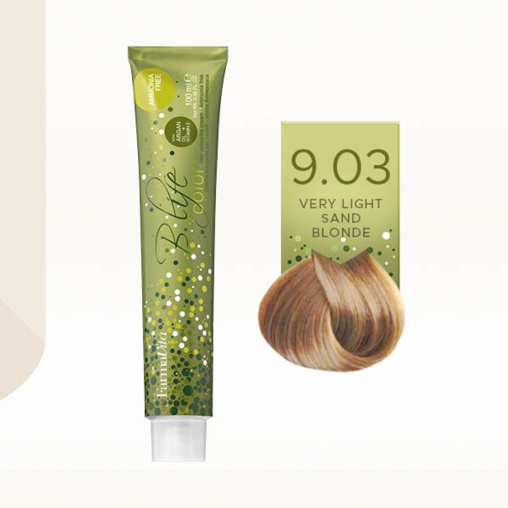 FarmaVita B Life je profesionalna veoma svetla peščano plava (9.03) farba za kosu bez amonijaka. Njena nežna formula obogaćena je arganovim uljem koje sprečava alergije, peckanje i svrab, a uz to omekšava, revitalizuje i poboljšava elastičnost kose.