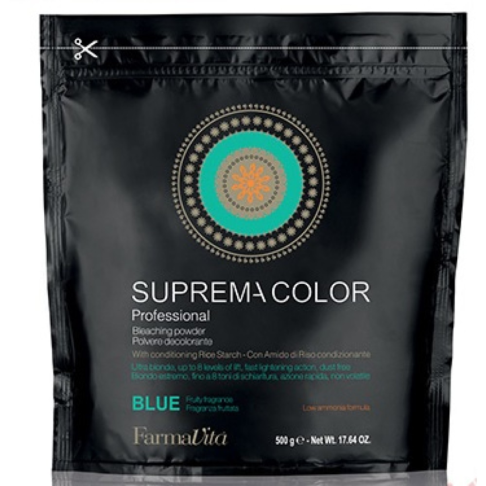 FarmaVita Suprema Color plavi blanš za kosu bez prašine omogućava posvetljivanje do čak osam tonova, dok kondicionira vlakna kose pirinčanim skrobom. Pogodan je za sve tehnike izbeljivanja kose. Dostupan je i u pakovanjima od 30 i 70 grama.