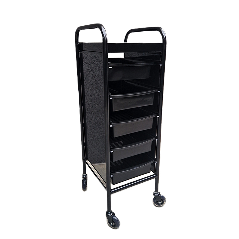 Četvrtasta kolica sa metalnom konstrukcijom i plastičnim stranicama, sa 5 plastičnih fioka, čistom površinom i točkićima.