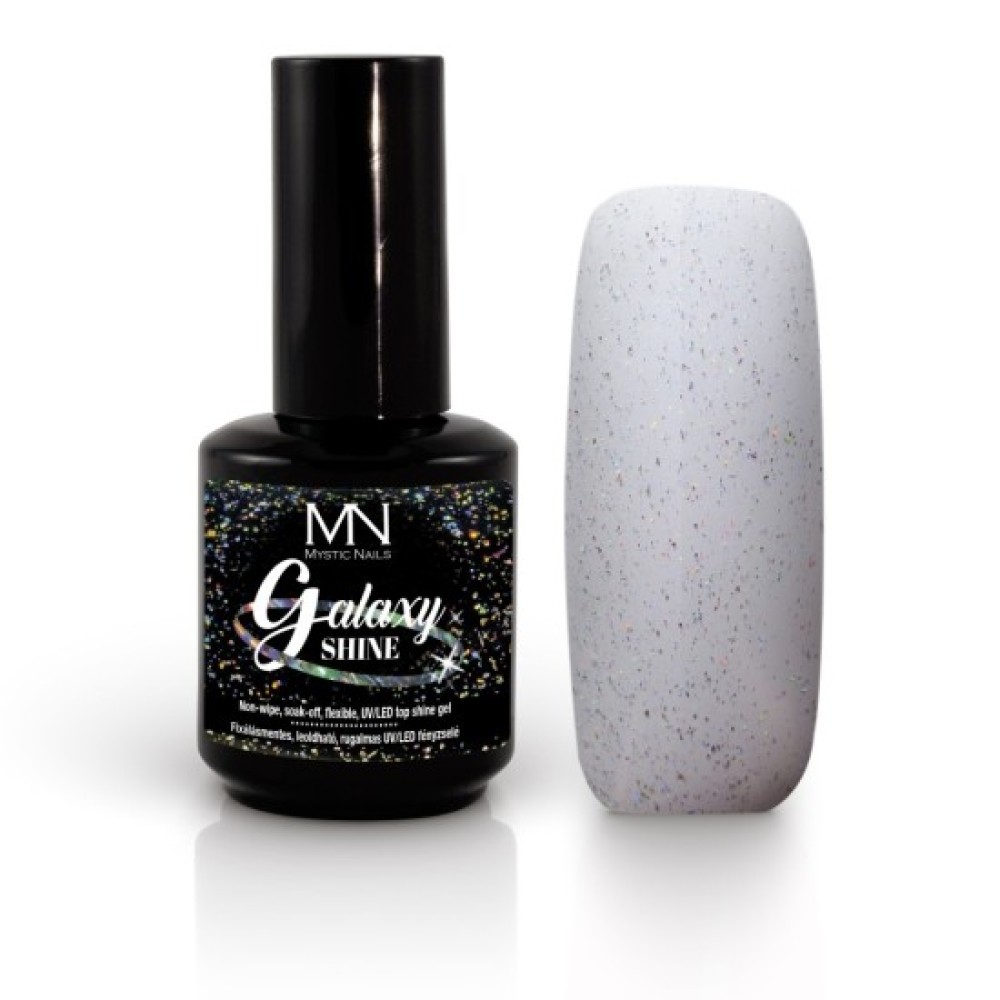 Sitne hologramske svetlucave čestice čine providni završni gel savršenim. Njegova gusta konzistencija dozvoljava da nanesete čak i na 5 noktiju u isto vreme, neće da se slije u zanoktice. Može da se koristiti preko bilo kog materijala (akril, gel akril , gel , gel lak) jer je fleksibilan. Bez lepljivog sloja.