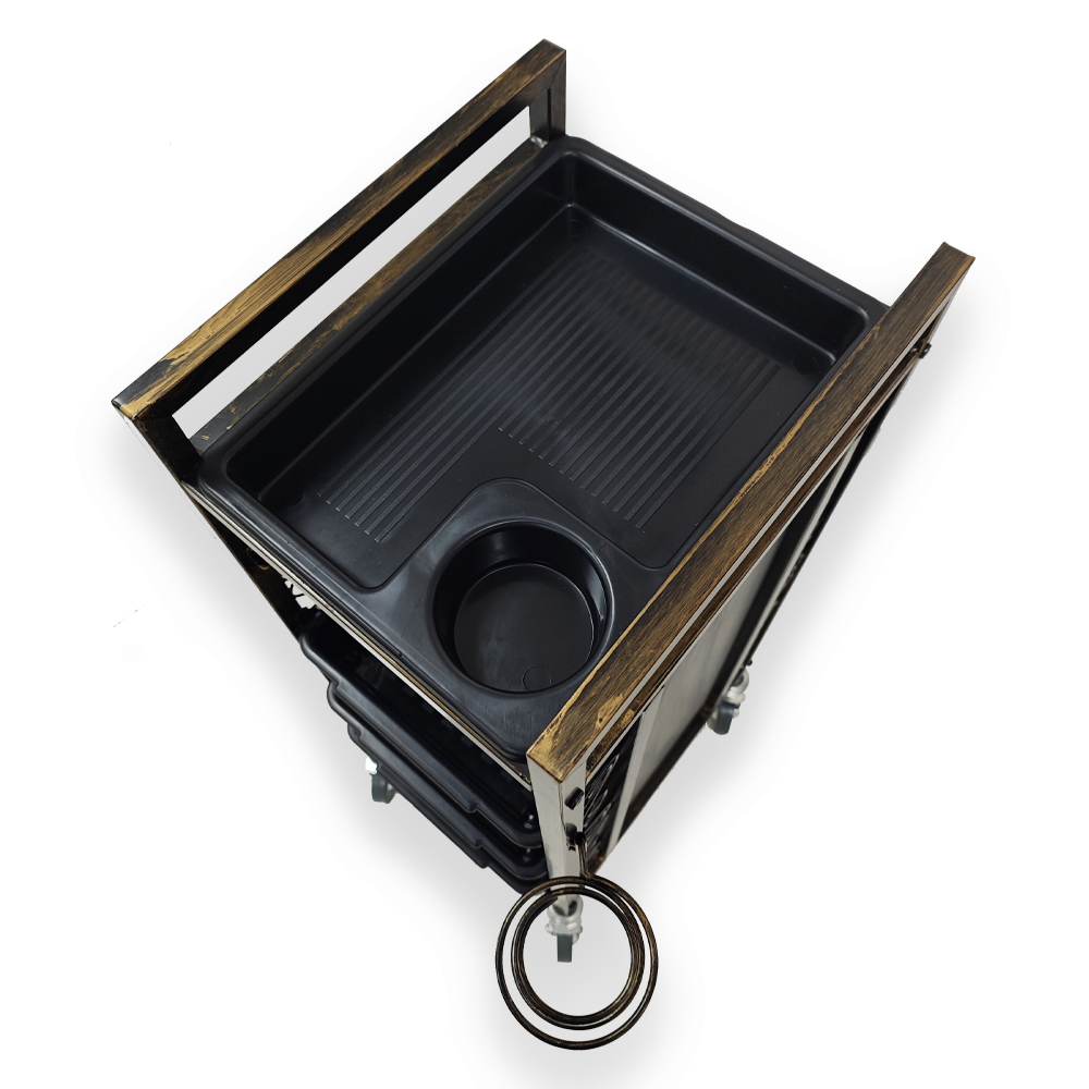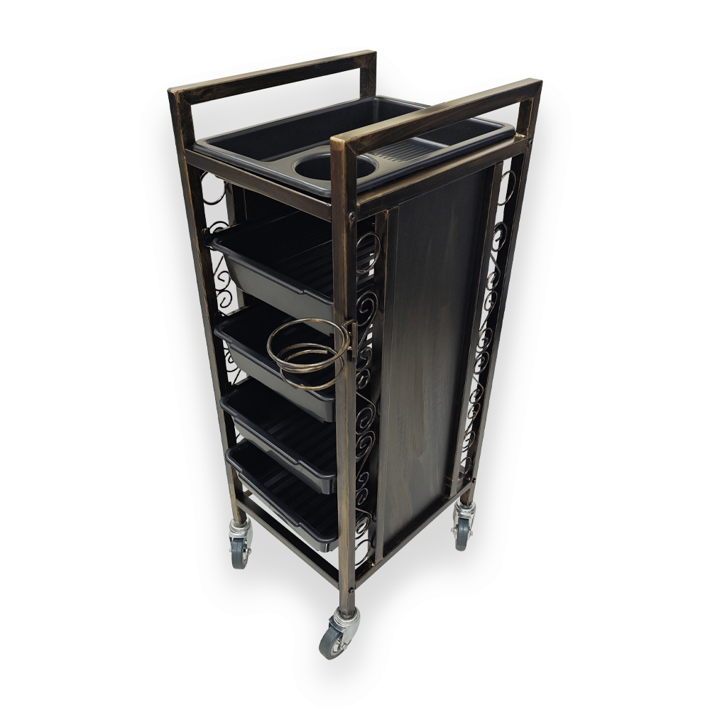 Četvrtasta otvorena kolica sa metalnom konstrukcijom, sa 4 fijoke od plastike u crnoj boji i točkićima.