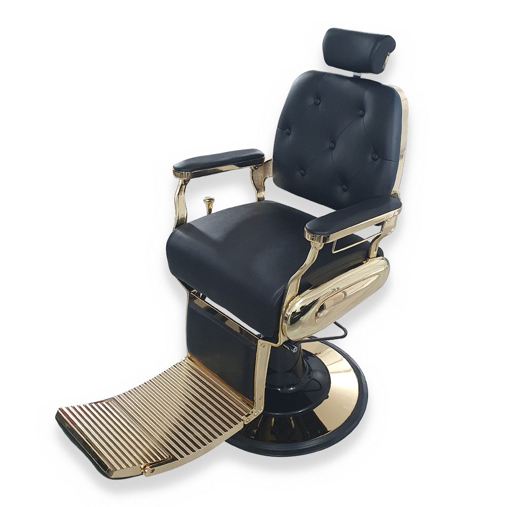 Stolica za muške frizerske salone sa nožnom hidraulikom, hromiranom ravnom okruglom bazom sa gumiranim dnom, podizanjem naslona glave za potrebe brijanja i sa naslonom za odmaranje nogu.