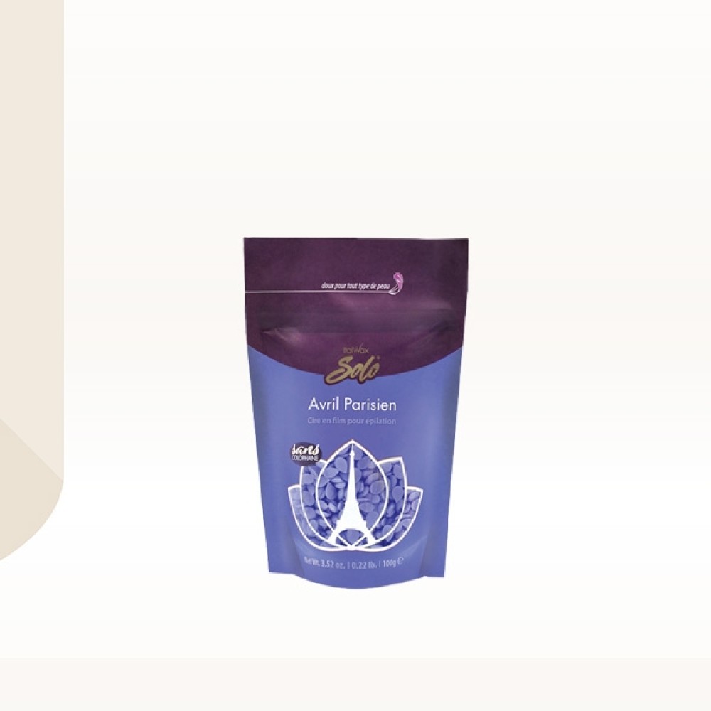 Italwax Solo Avril Parisien je film vosak za depilaciju, ljubičaste boje na bazi visokokvalitetnih sintetičkih polimera obogaćen prijatnom aromom orhideje. U otopljenom stanju postaje potpuno providan. Idealan je za osetljivu kožu jer ne sadrži prirodne sastojke koji mogu izazvati reakcije.