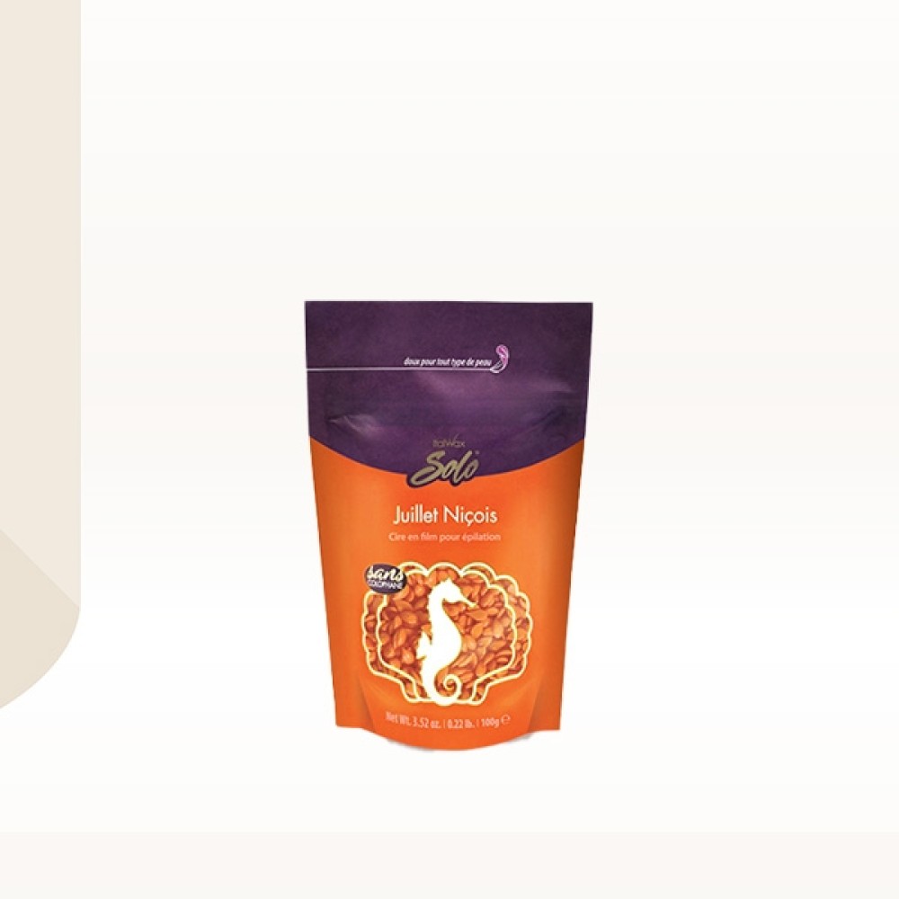 Italwax SOLO film vosak za depilaciju Julliet Nicois je vosak na bazi sintetičke smole idealan za sve tipove osetljive kože jer ne sadrži prirodne alergene. Ovaj vosak prelepe narandžaste boje može se koristiti za sve tipove dlaka, a uklanja i jako kratke dlake od svega 1mm.