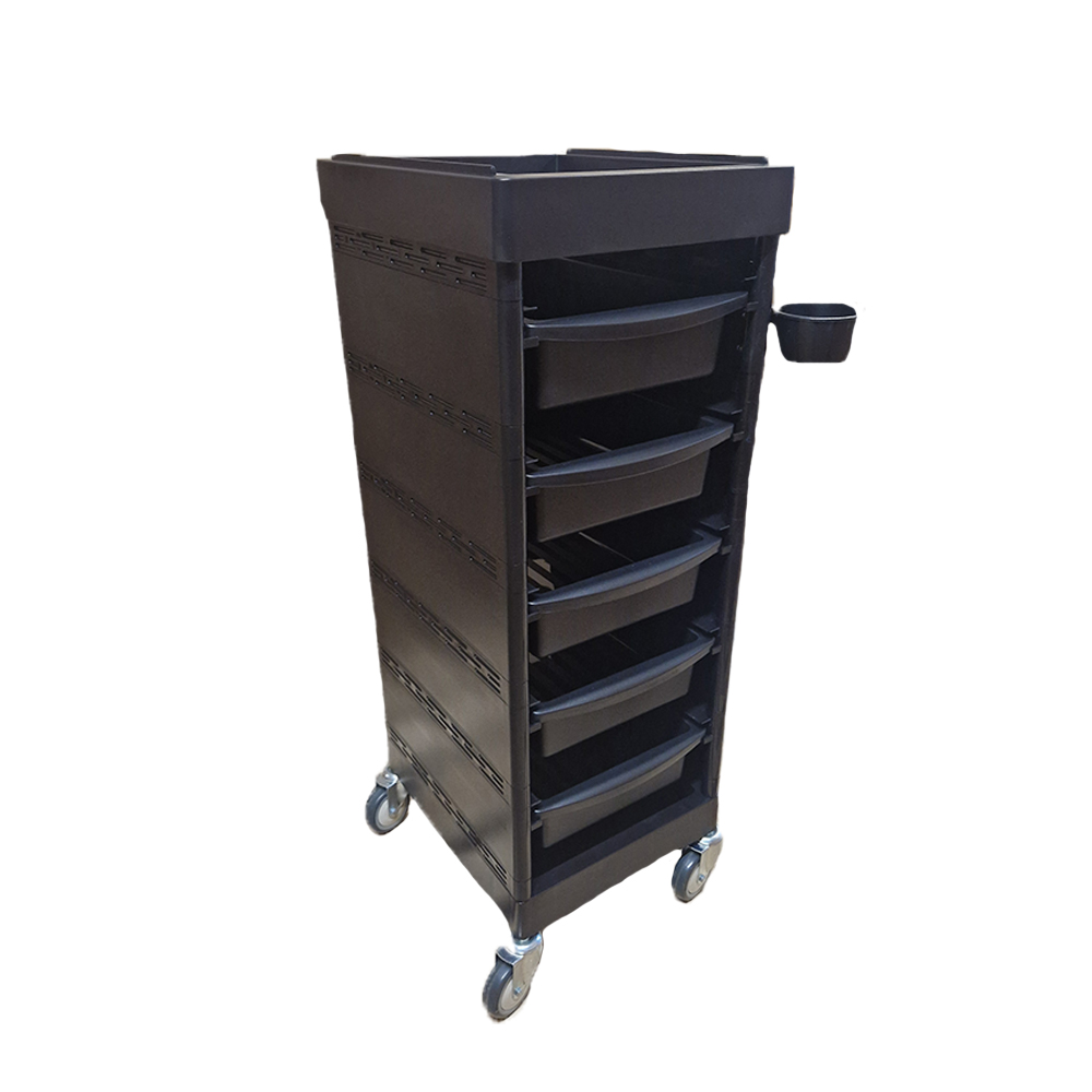 Četvrtasta kolica sa metalnom konstrukcijom i plastičnim stranicama, sa 5 plastičnih fioka, čistom površinom i točkićima.