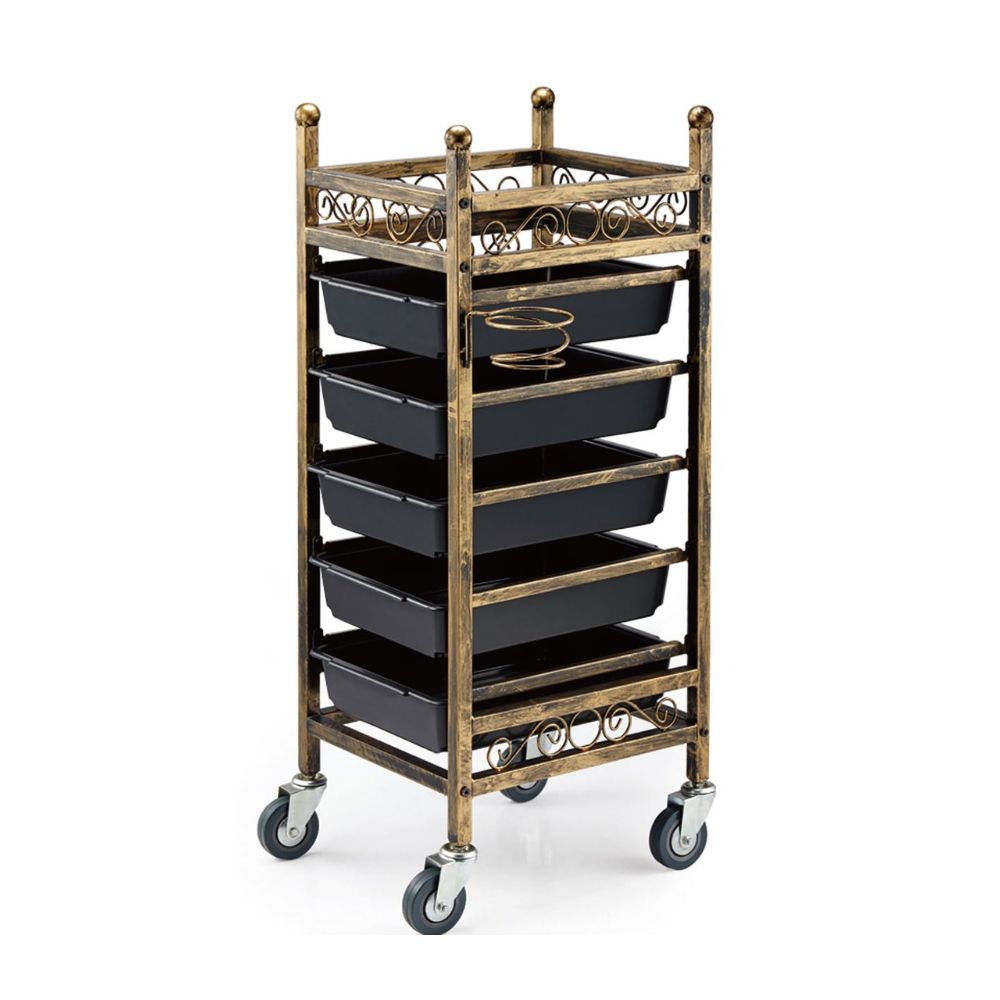 Četvrtasta otvorena kolica sa metalnom konstrukcijom, sa 5 fijoka od plastike u crnoj boji i točkićima.
