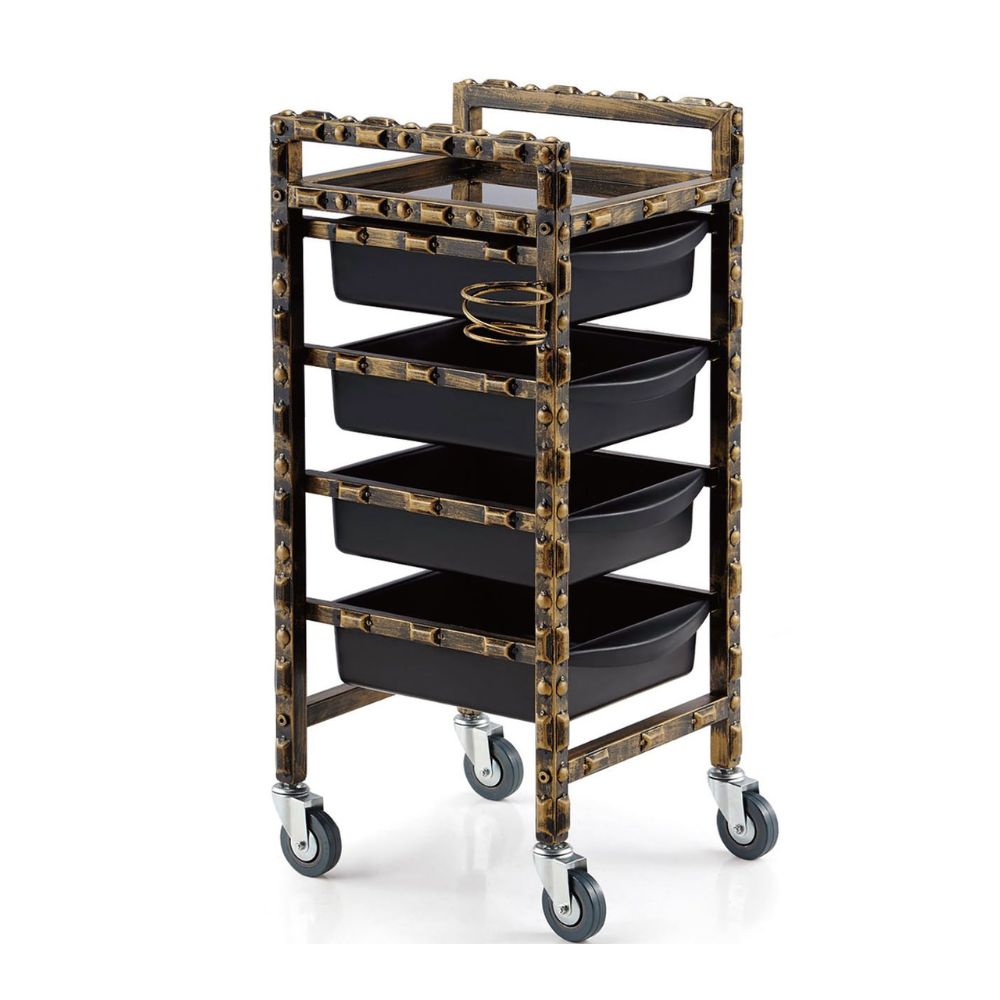 Četvrtasta otvorena kolica sa metalnom konstrukcijom, sa 4 fijoke od plastike u crnoj boji i točkićima.