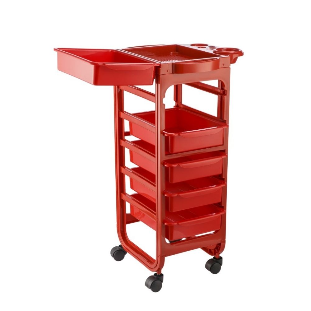 Četvrtasta poluotvorena kolica od plastike u sivoj ili crvenoj boji, sa 5 fioka i točkićima.