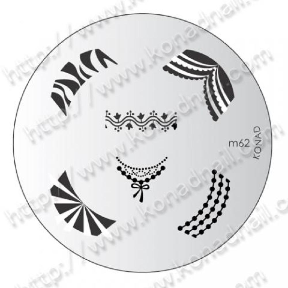 Metalna pločica sa ugraviranim ukrasnim motivima. Način upotrebe : Naneti manju količinu Konad specijalnog laka za pečatiranje na ukrasni motiv. Ogrebati višak laka sa pločice Konad grebačem. Specijalnim gumenim Konad pečatom preneti motiv sa pločice na nokat.
