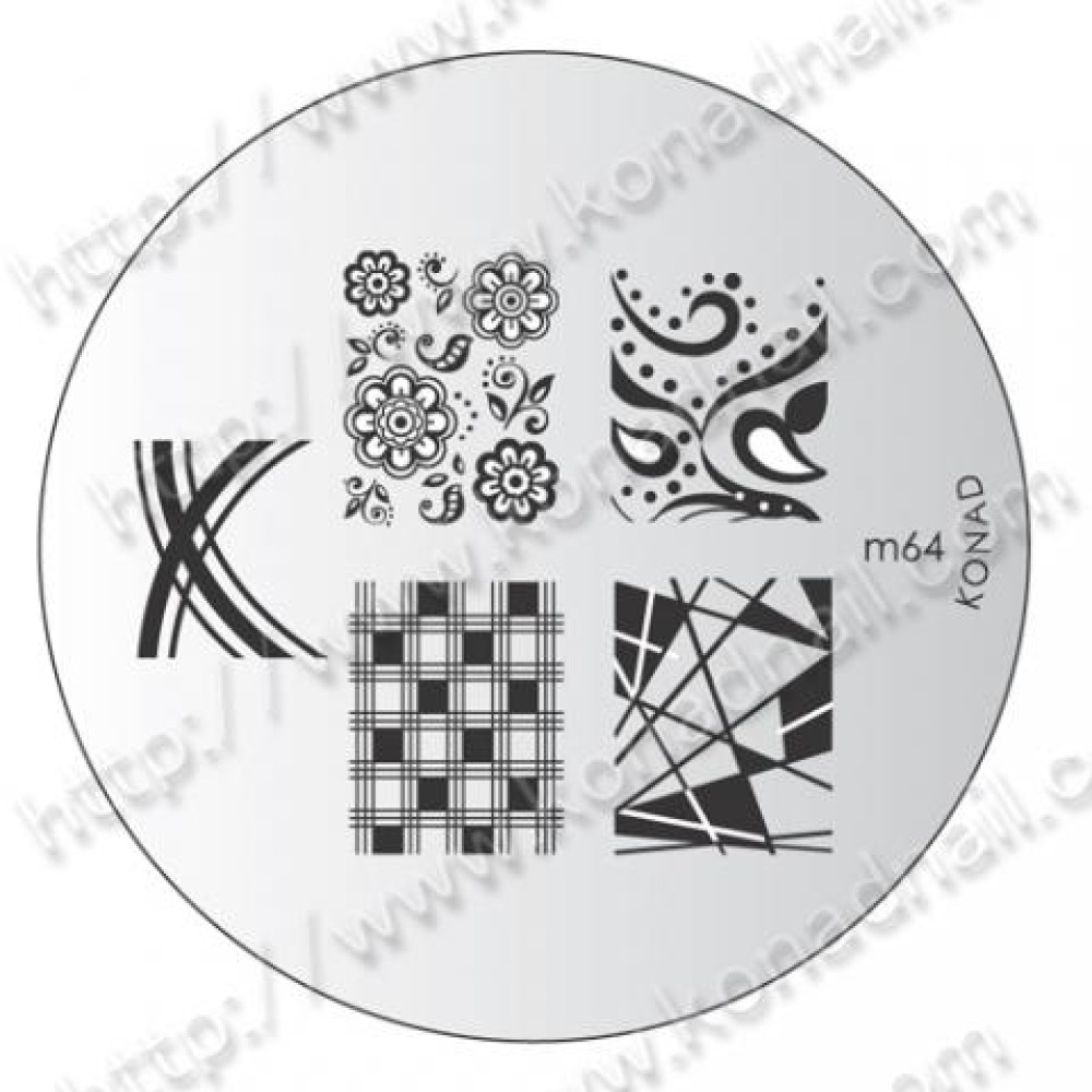 Metalna pločica sa ugraviranim ukrasnim motivima. Način upotrebe : Naneti manju količinu Konad specijalnog laka za pečatiranje na ukrasni motiv. Ogrebati višak laka sa pločice Konad grebačem. Specijalnim gumenim Konad pečatom preneti motiv sa pločice na nokat.