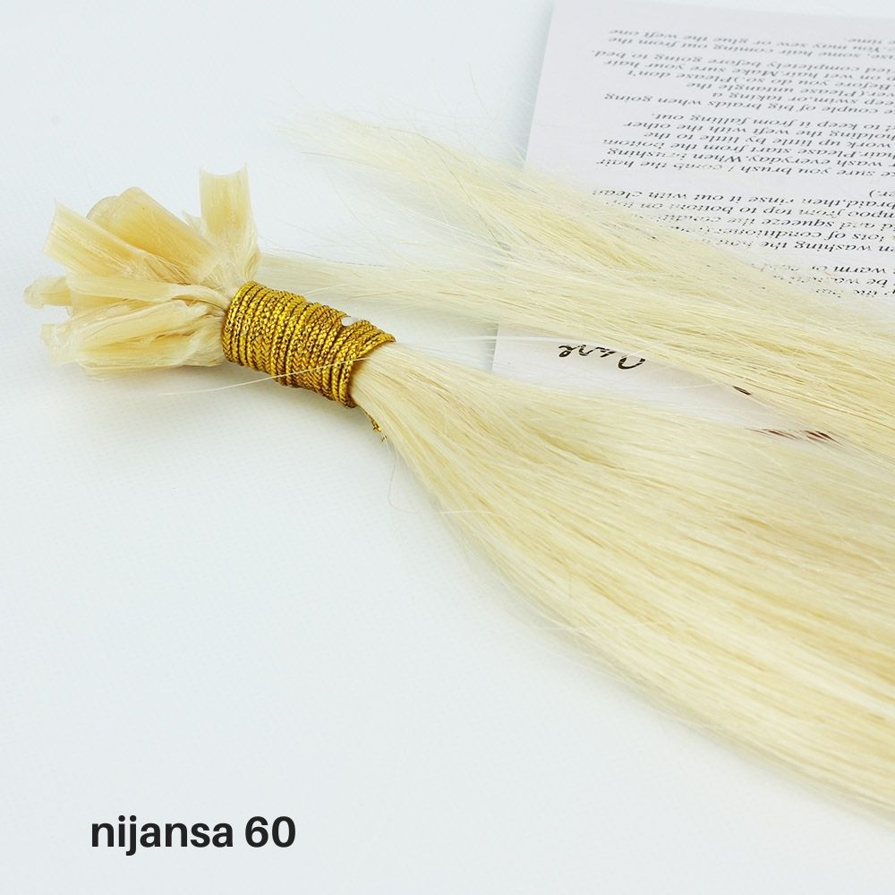 Pramenovi od 100 % prirodne kose, dužine 60 cm, sa keratinom u obliku nokta na vrhu, predviđeni za nadogradnju keratinom.