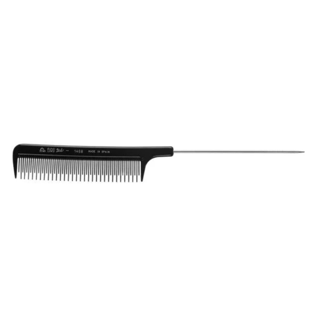 Češalj za deljenje kose sa metalnom iglom izrađen od plastike.