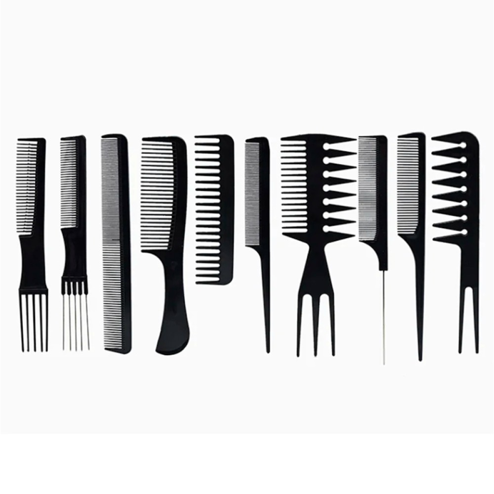 Set se sastoji od 10 češljeva kao što su: češljevi namenjeni za mašinsko šišanje, češalj za pramenove, češalj za muški stil, češalj sa metalnom iglom i drugi.