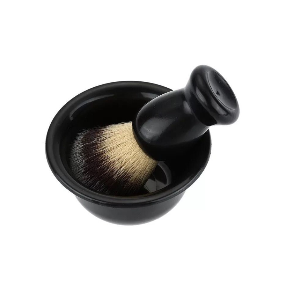 Praktični set za brijanje koji uključuje PVC stalak, PVC činiju za brijanje i četku za brijanje.
