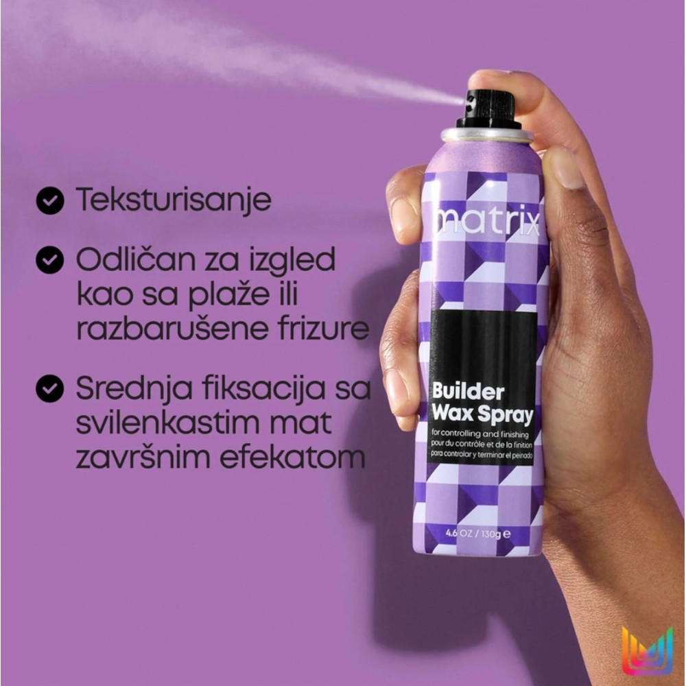 Matrix Builder aerosolni vosak za svilenkasti-mat završni efekat srednjeg nivoa fiksacije. Koristite ga za kontrolu frizure i kao poslednji korak u stilizovanju kose. Ovaj proizvod se lako upotrebljava i nudi kombinaciju fiksacije laka za kosu sa kontrolom i teksturom voska za kosu. Veganska formula.*