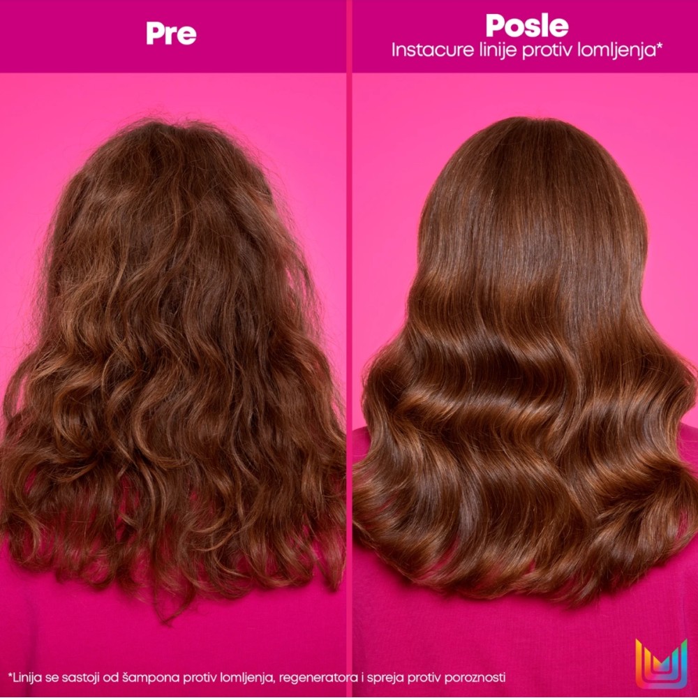 InstaCure liniju protiv lomljenja čine šampon, regenerator i sprej protiv poroznosti, stvarajući zaglađenu i uravnoteženu površinu.
