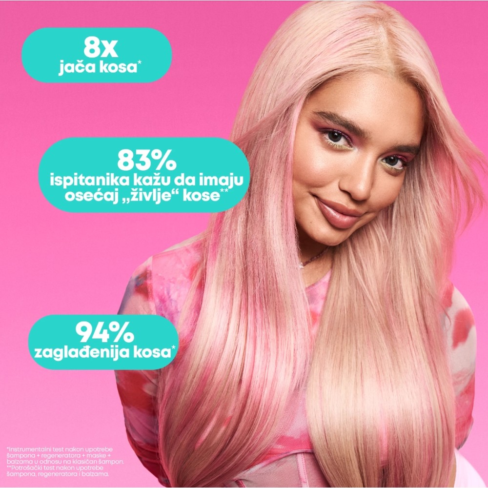Naneti na vlažnu kosu. Utrljati i dobro isprati. Nastaviti rutinu nege sa regeneratorom iz iste kolekcije.