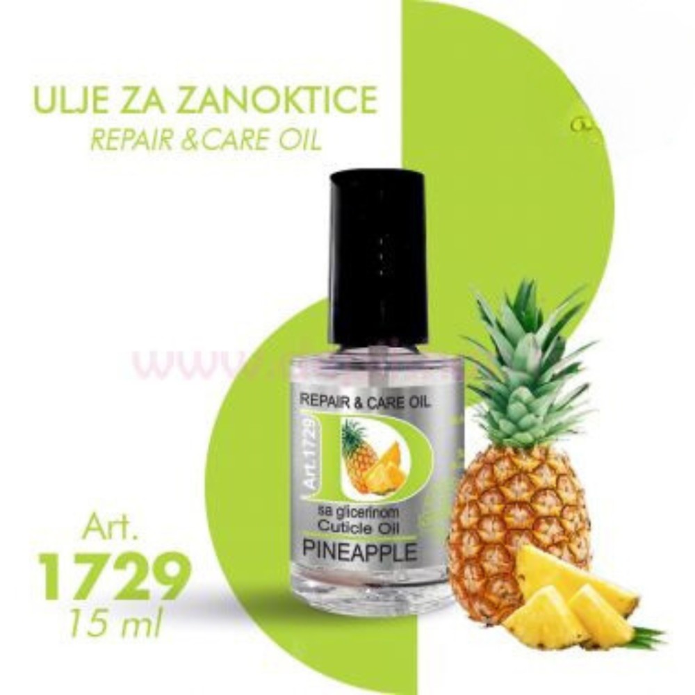 Ulje za zanoktice sa glicerinom i ekstraktom ananasa. Regeneriše, omekšava i vlaži zanoktice tako da ih možete oblikovati ili ukloniti a ujedno jača nokte i daje im elastičnost. Način upotrebe: ulje nanosite svakodnevno naročito na dno nokta. Kada se preparat upije pogurajte zanoktice nežno unazad. Ulje možete koristiti i preko lakiranih noktiju jer ne oštećuje lak. Promućkati pre upotrebe.