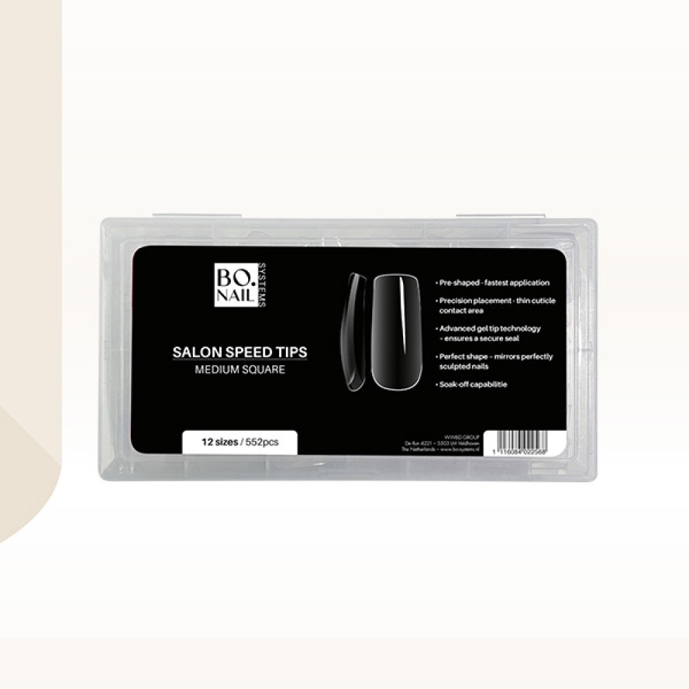 BO Nails "Medium Square" Speed tipse su lake za upotrebu i udobne za nošenje, i obezbeđuju da imate prelepe i jake ekstenzije noktiju i do 4 nedelje. Baš kao što im ime kaže, ove tipse predstavljaju rešenje za dobijanje prelepih noktiju na najbrži i najefikasniji način. Pažljivo su napravljene da kreiraju bezbedna, udobna i lagana poboljšanja noktiju. Vrlo lako se uklanjaju uz pomoć BO Nails "Removera".