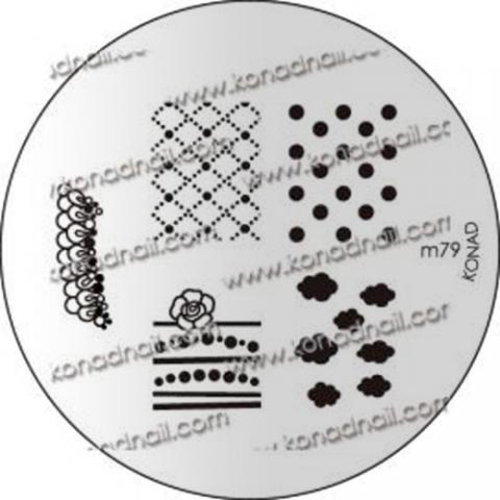 Metalna pločica sa ugraviranim ukrasnim motivima. Način upotrebe : Naneti manju količinu Konad specijalnog laka za pečatiranje na ukrasni motiv. Ogrebati višak laka sa pločice Konad grebačem. Specijalnim gumenim Konad pečatom preneti motiv sa pločice na nokat
