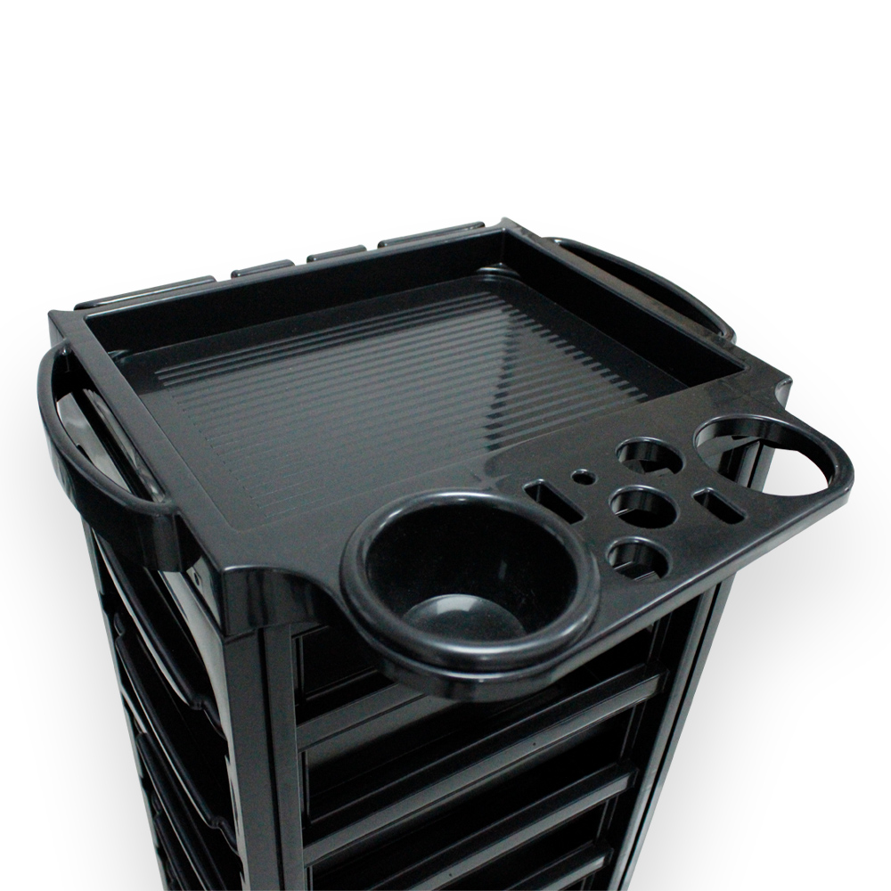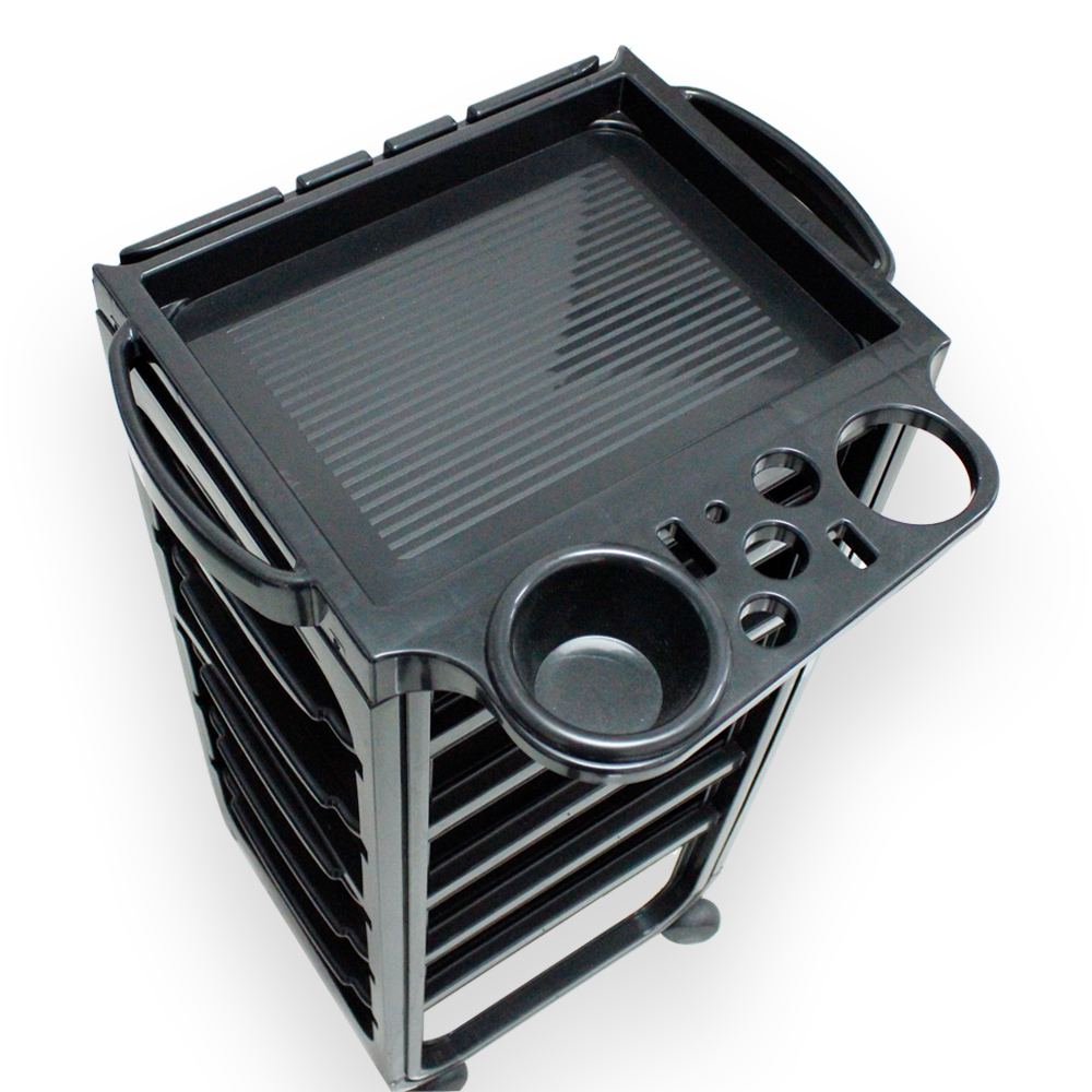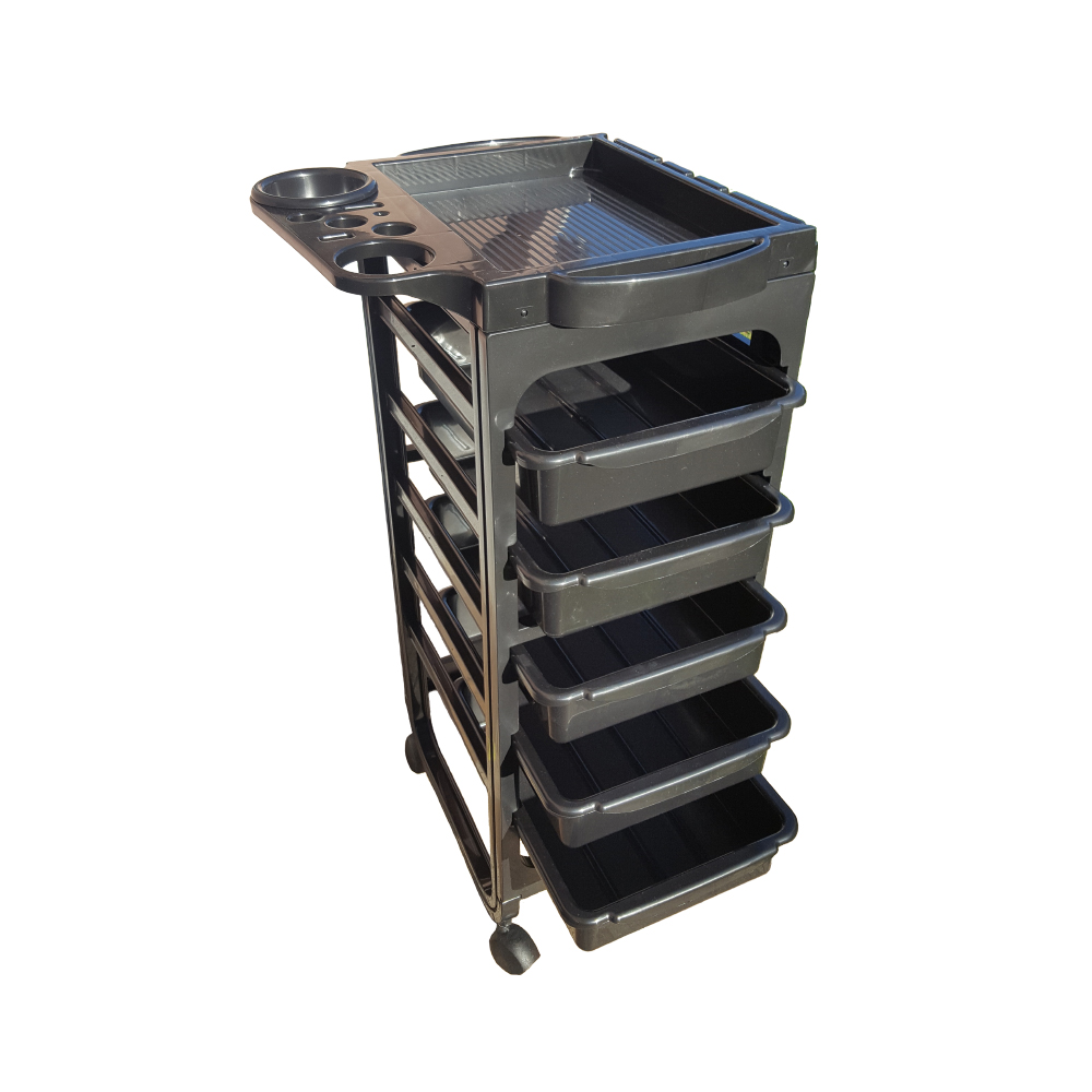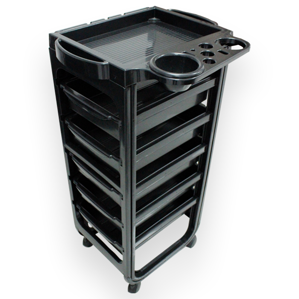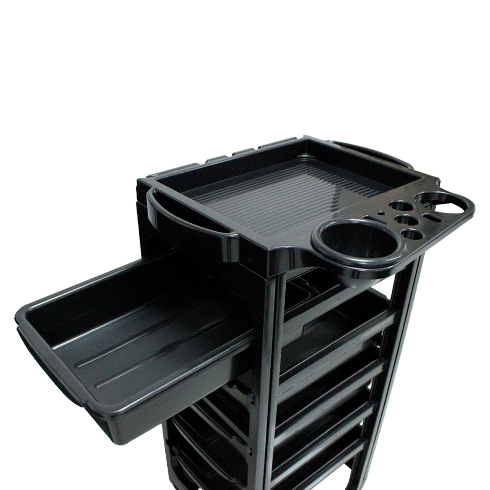 Četvrtasta poluotvorena kolica od plastike u crnoj boji, sa 5 fioka i točkićima.
