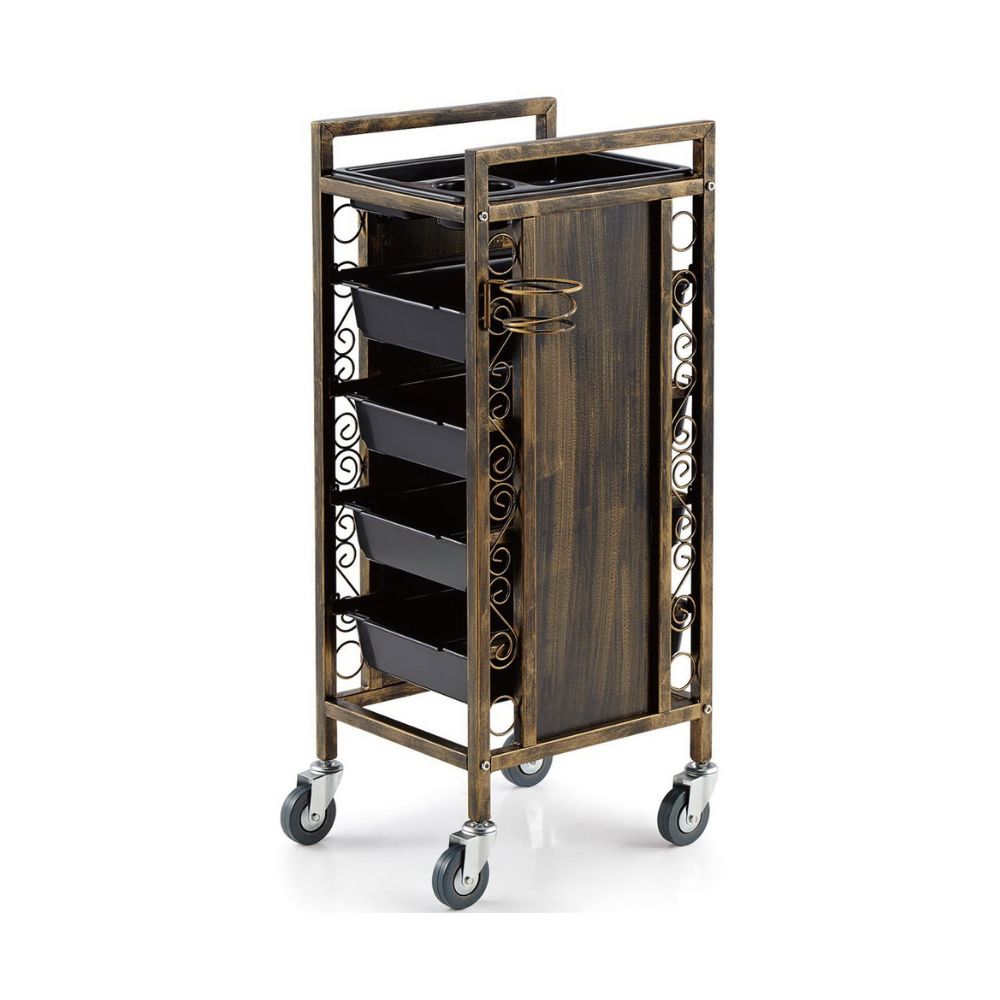 Četvrtasta otvorena kolica sa metalnom konstrukcijom, sa 4 fijoke od plastike u crnoj boji i točkićima.