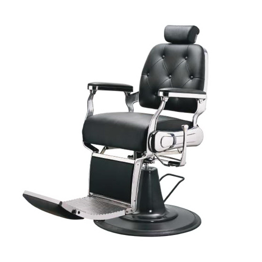 Stolica za muške frizerske salone sa nožnom hidraulikom, hromiranom ravnom okruglom bazom sa gumiranim dnom, podizanjem naslona glave za potrebe brijanja i sa naslonom za odmaranje nogu.