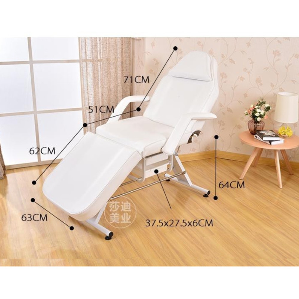 Kozmetički ležaj izuzetnog kvaliteta, sa otvorom za lice. Karakteriše ga visokokvalitetna presvlaka i materijali. Lako podesiv po visini, jednostavno se rasklapa u horizontalan položaj. Sa tri pomoćne fioke. Dimenzije: 191 x 62 x 66 cm.