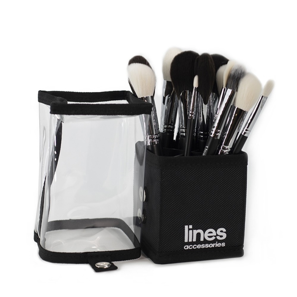 Donja polovina torbice je napravljena od čvrstog materijala, gornja polovina od mekanog providnog. Rasklapanjem ove torbice dobijamo dva stalka za četkice.