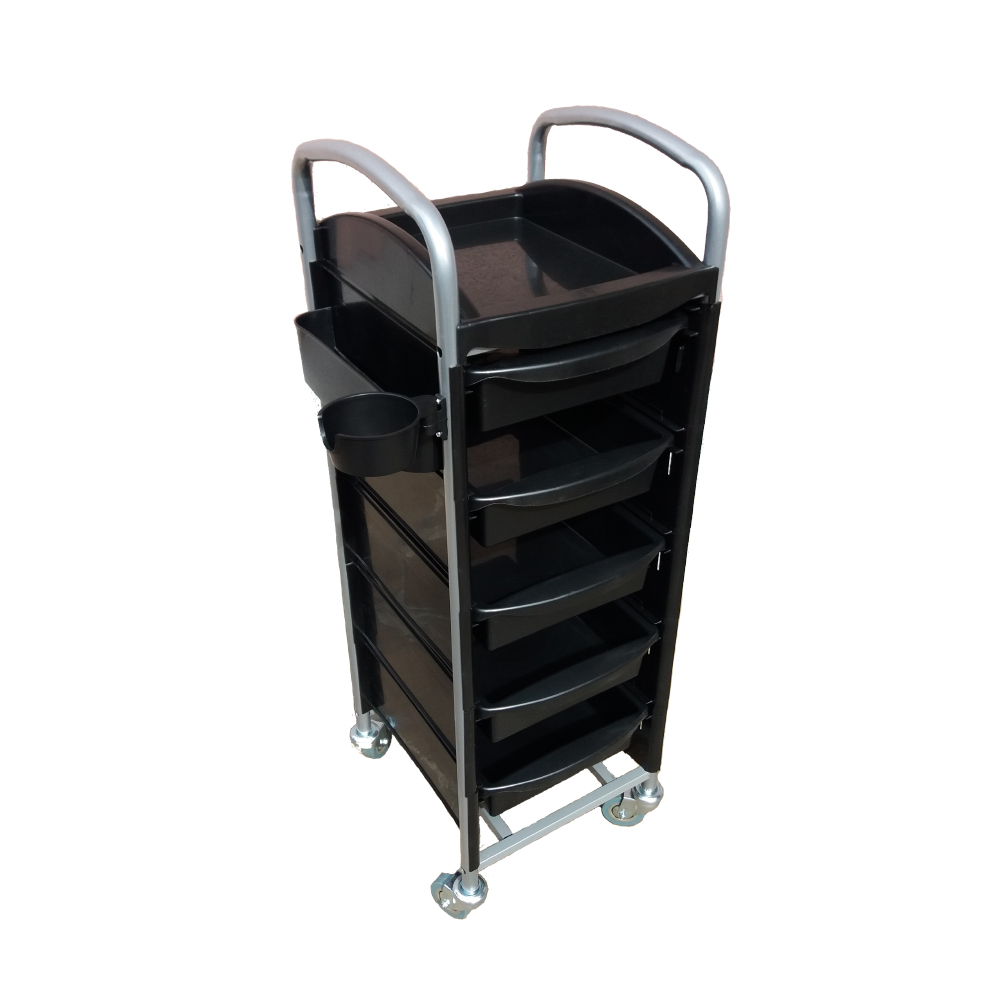 Četvrtasta crna kolica sa hromiranom metalnom konstrukcijom, sa 5 fioka i točkićima.