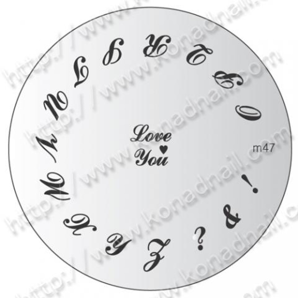 Metalna pločica sa ugraviranim ukrasnim motivima. Način upotrebe : Naneti manju količinu Konad specijalnog laka za pečatiranje na ukrasni motiv. Ogrebati višak laka sa pločice Konad grebačem. Specijalnim gumenim Konad pečatom preneti motiv sa pločice na nokat.