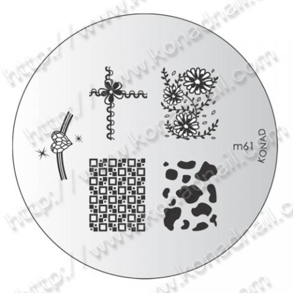 Metalna pločica sa ugraviranim ukrasnim motivima. Način upotrebe : Naneti manju količinu Konad specijalnog laka za pečatiranje na ukrasni motiv. Ogrebati višak laka sa pločice Konad grebačem. Specijalnim gumenim Konad pečatom preneti motiv sa pločice na nokat.