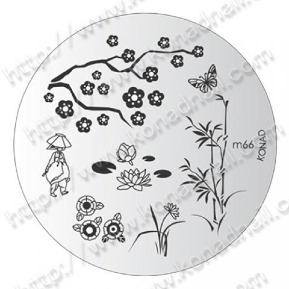 Metalna pločica sa ugraviranim ukrasnim motivima. Način upotrebe : Naneti manju količinu Konad specijalnog laka za pečatiranje na ukrasni motiv. Ogrebati višak laka sa pločice Konad grebačem. Specijalnim gumenim Konad pečatom preneti motiv sa pločice na nokat.
