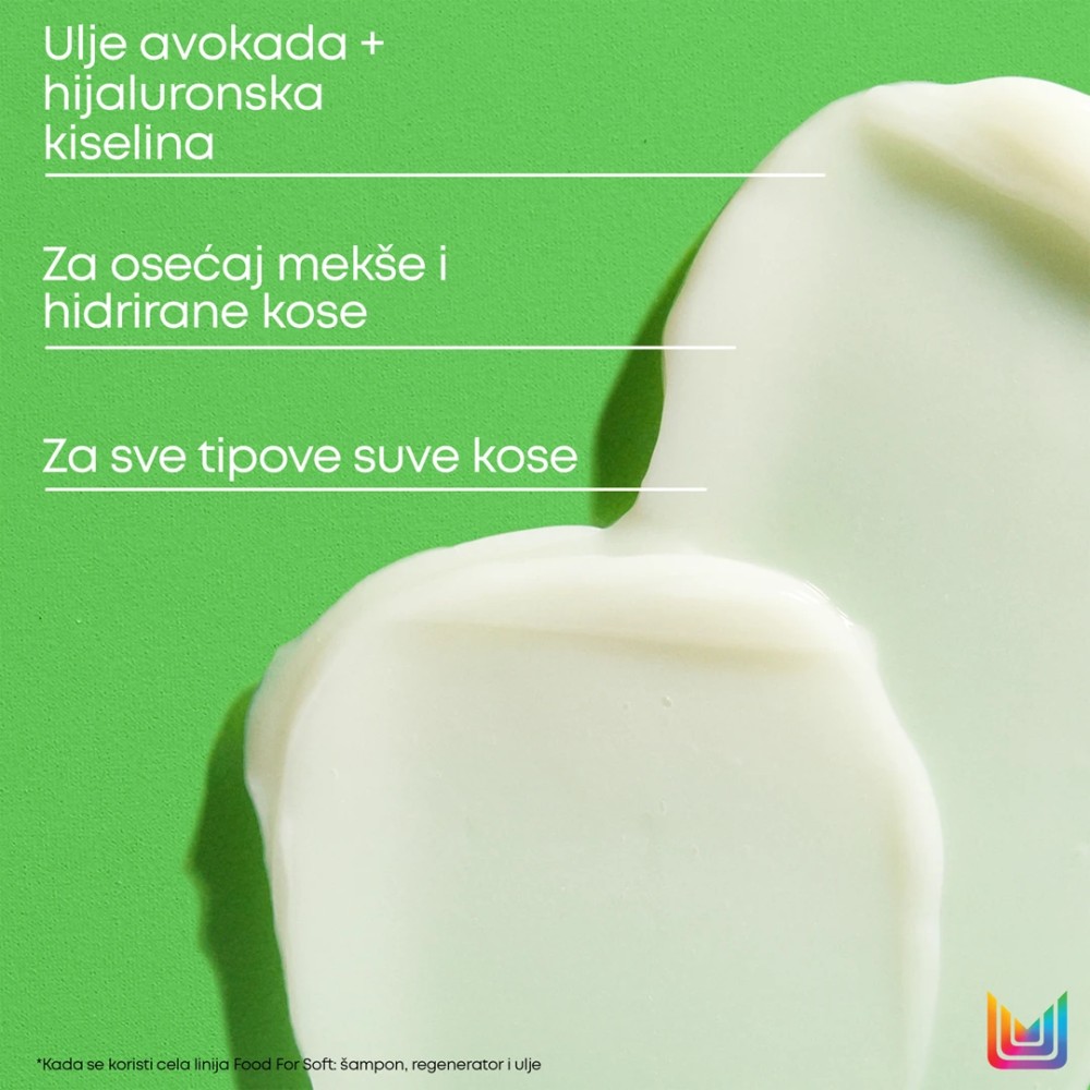 Matrix Food For Soft hidratantni šampon obogaćen uljem avokada i hijaluronskom kiselinom koji ciljano deluje na suvu kosu i trenutno je transformiše, čineći je mekom na dodir. Obezbeđuje 7 puta više hidratacije* i do 72 sata.**