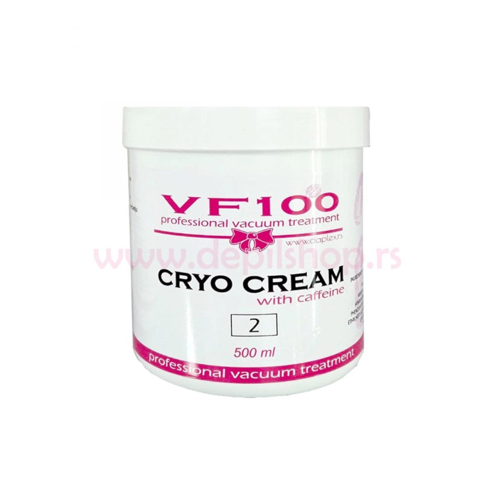 CRYO CREAM se upotrebljava za tretmane celulita, mršavljenja, zatezanja kože, poboljšanje izgleda tela i smanjenja obima. Aktivne komponente VF100 Cryo cream imaju učvršćujući efekat na održavanje vitke linije. Uputstvo za upotrebu: kremu naneti kružnim pokretima, umasirati kružnim pokretima preko VF100 Hot gela na kožu klijenta, a zatim klijenta upakovati u kesu. Ne nanositi na kožu lica, oštećenu i osetljivu i sveže izdepiliranu kožu tela. Pakovanje 500ml.