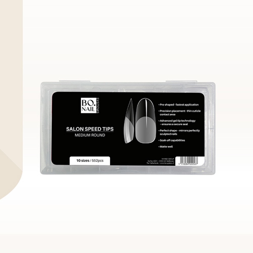 BO Nails "Medium Round" Speed tipse su lake za upotrebu i udobne za nošenje, i obezbeđuju da imate prelepe i jake ekstenzije noktiju i do 4 nedelje. Baš kao što im ime kaže, ove tipse predstavljaju rešenje za dobijanje prelepih noktiju na najbrži i najefikasniji način. Pažljivo su napravljene da kreiraju bezbedna, udobna i lagana poboljšanja noktiju. Vrlo lako se uklanjaju uz pomoć BO Nails "Removera".